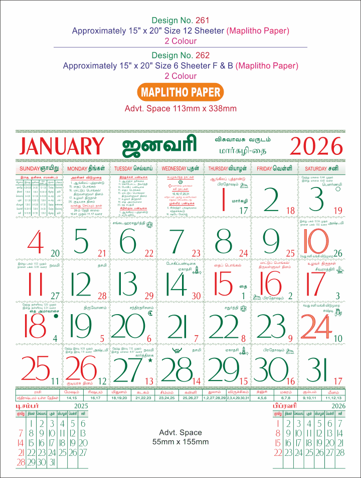 P261 Tamil - 15x20" 12 Sheeter monthly calendar 2026 Print Printers in Chennai, Coimbatore, Thanjavur, Madurai, Tiruchirappalli, Salem, Tiruppur, Erode, Vellore, Tirunelveli and all across Tamil Nadu, we provide high quality P261 Tamil - 15x20" 12 Sheeter monthly calendar 2026 Print printing proudct from Sivakasi. We print in all size, unique and customized designs with defferent media. Plesae check out our latest P261 Tamil - 15x20" 12 Sheeter monthly calendar 2026 Print price list, we ship P261 Tamil - 15x20" 12 Sheeter monthly calendar 2026 Print across Tamilnadu, India and Global.
