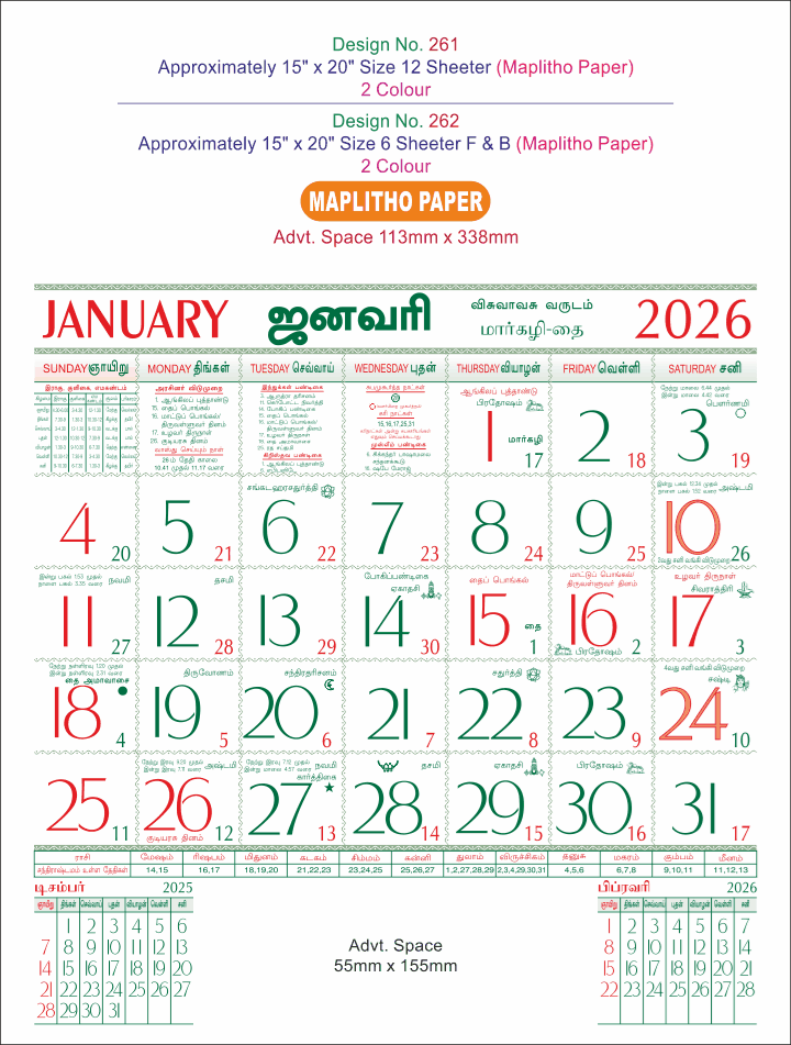 P262 Tamil - 15x20" 6 Sheeter monthly calendar 2026 Print Printers in Chennai, Coimbatore, Thanjavur, Madurai, Tiruchirappalli, Salem, Tiruppur, Erode, Vellore, Tirunelveli and all across Tamil Nadu, we provide high quality P262 Tamil - 15x20" 6 Sheeter monthly calendar 2026 Print printing proudct from Sivakasi. We print in all size, unique and customized designs with defferent media. Plesae check out our latest P262 Tamil - 15x20" 6 Sheeter monthly calendar 2026 Print price list, we ship P262 Tamil - 15x20" 6 Sheeter monthly calendar 2026 Print across Tamilnadu, India and Global.