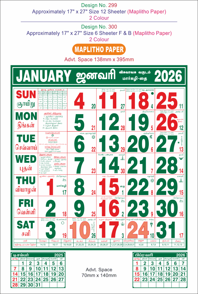 P299 Tamil - 17x27" 12 Sheeter monthly calendar 2026 Print Printers in Chennai, Coimbatore, Thanjavur, Madurai, Tiruchirappalli, Salem, Tiruppur, Erode, Vellore, Tirunelveli and all across Tamil Nadu, we provide high quality P299 Tamil - 17x27" 12 Sheeter monthly calendar 2026 Print printing proudct from Sivakasi. We print in all size, unique and customized designs with defferent media. Plesae check out our latest P299 Tamil - 17x27" 12 Sheeter monthly calendar 2026 Print price list, we ship P299 Tamil - 17x27" 12 Sheeter monthly calendar 2026 Print across Tamilnadu, India and Global.