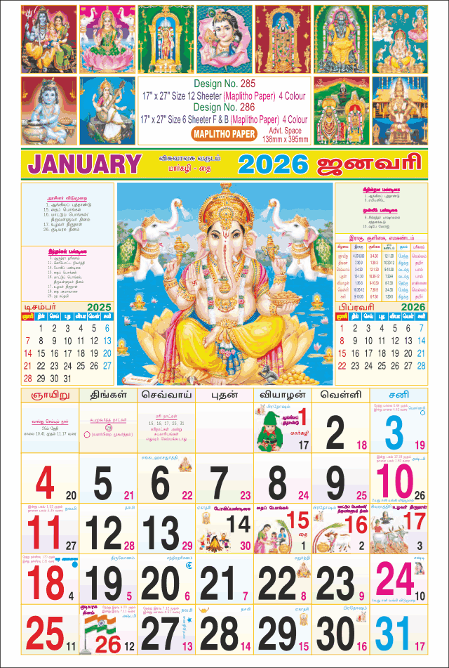 P286 Tamil - 17x27" 6 Sheeter monthly calendar 2026 Print Printers in Chennai, Coimbatore, Thanjavur, Madurai, Tiruchirappalli, Salem, Tiruppur, Erode, Vellore, Tirunelveli and all across Tamil Nadu, we provide high quality P286 Tamil - 17x27" 6 Sheeter monthly calendar 2026 Print printing proudct from Sivakasi. We print in all size, unique and customized designs with defferent media. Plesae check out our latest P286 Tamil - 17x27" 6 Sheeter monthly calendar 2026 Print price list, we ship P286 Tamil - 17x27" 6 Sheeter monthly calendar 2026 Print across Tamilnadu, India and Global.