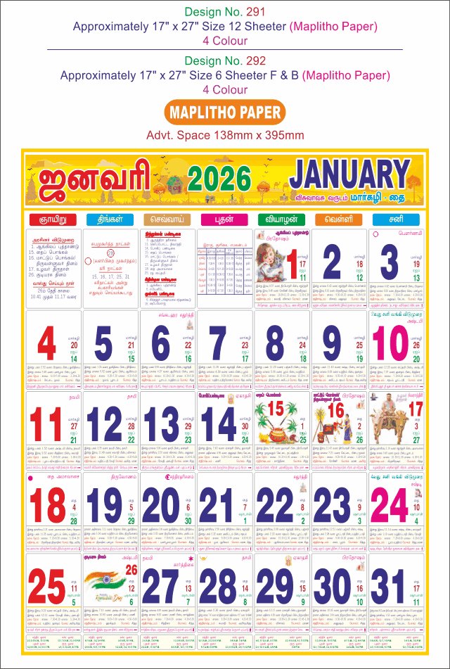 P292 Tamil - 17x27" 6 Sheeter monthly calendar 2026 Print Printers in Chennai, Coimbatore, Thanjavur, Madurai, Tiruchirappalli, Salem, Tiruppur, Erode, Vellore, Tirunelveli and all across Tamil Nadu, we provide high quality P292 Tamil - 17x27" 6 Sheeter monthly calendar 2026 Print printing proudct from Sivakasi. We print in all size, unique and customized designs with defferent media. Plesae check out our latest P292 Tamil - 17x27" 6 Sheeter monthly calendar 2026 Print price list, we ship P292 Tamil - 17x27" 6 Sheeter monthly calendar 2026 Print across Tamilnadu, India and Global.