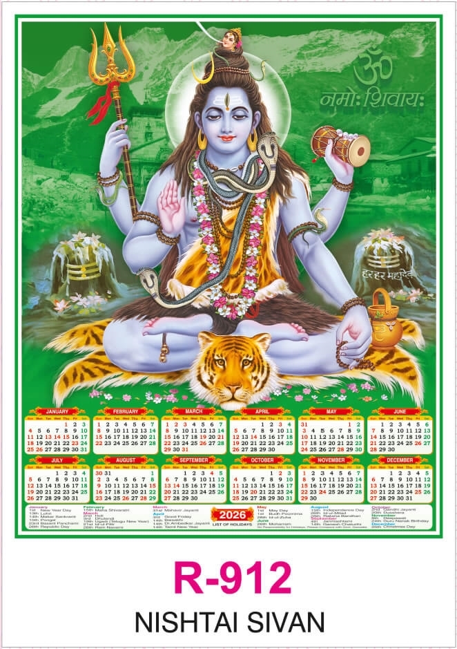 R912 Nistai Shivan - 19x29" Real Art Calendar 2026 Print Printers in Chennai, Coimbatore, Thanjavur, Madurai, Tiruchirappalli, Salem, Tiruppur, Erode, Vellore, Tirunelveli and all across Tamil Nadu, we provide high quality R912 Nistai Shivan - 19x29" Real Art Calendar 2026 Print printing proudct from Sivakasi. We print in all size, unique and customized designs with defferent media. Plesae check out our latest R912 Nistai Shivan - 19x29" Real Art Calendar 2026 Print price list, we ship R912 Nistai Shivan - 19x29" Real Art Calendar 2026 Print across Tamilnadu, India and Global.