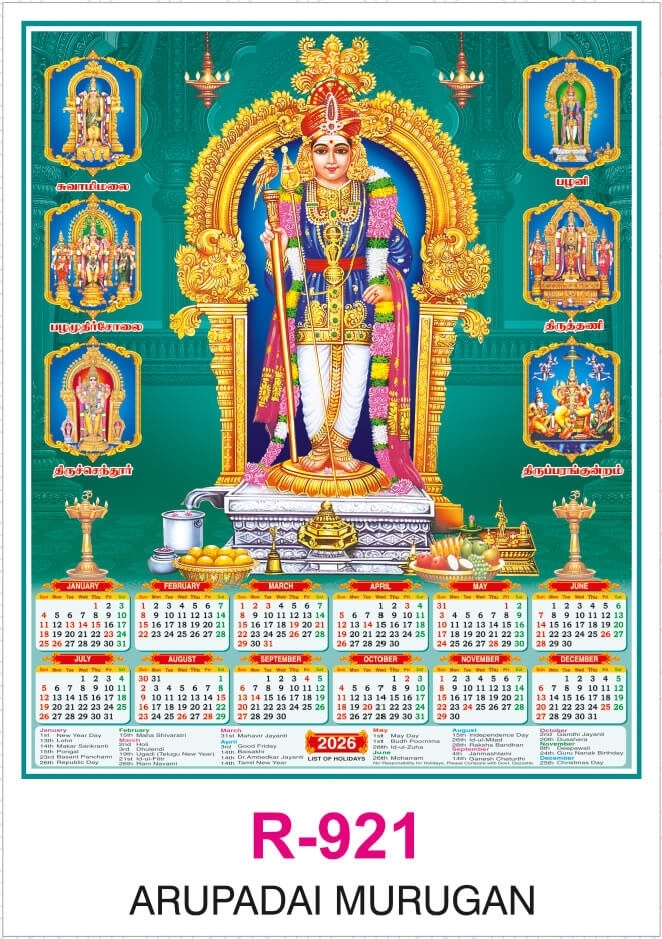 R921 Murugan - 19x29" Real Art Calendar 2026 Print Printers in Chennai, Coimbatore, Thanjavur, Madurai, Tiruchirappalli, Salem, Tiruppur, Erode, Vellore, Tirunelveli and all across Tamil Nadu, we provide high quality R921 Murugan - 19x29" Real Art Calendar 2026 Print printing proudct from Sivakasi. We print in all size, unique and customized designs with defferent media. Plesae check out our latest R921 Murugan - 19x29" Real Art Calendar 2026 Print price list, we ship R921 Murugan - 19x29" Real Art Calendar 2026 Print across Tamilnadu, India and Global.