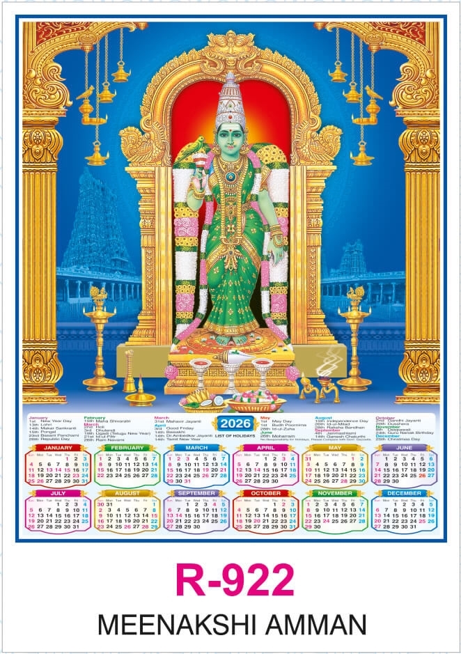 R922 Meenakshi Amman - 19x29" Real Art Calendar 2026 Print Printers in Chennai, Coimbatore, Thanjavur, Madurai, Tiruchirappalli, Salem, Tiruppur, Erode, Vellore, Tirunelveli and all across Tamil Nadu, we provide high quality R922 Meenakshi Amman - 19x29" Real Art Calendar 2026 Print printing proudct from Sivakasi. We print in all size, unique and customized designs with defferent media. Plesae check out our latest R922 Meenakshi Amman - 19x29" Real Art Calendar 2026 Print price list, we ship R922 Meenakshi Amman - 19x29" Real Art Calendar 2026 Print across Tamilnadu, India and Global.