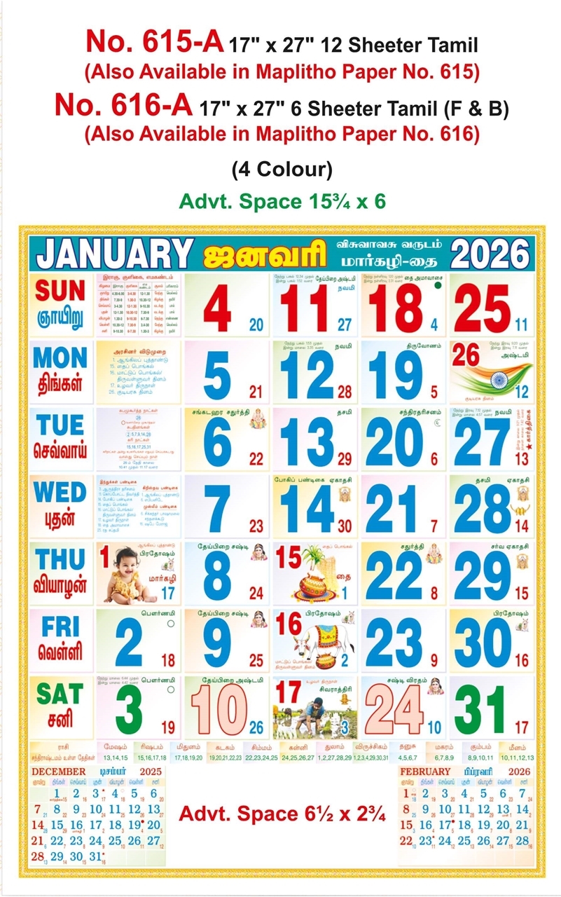 R616-A Tamil 6 Sheeter 17x27" - 100 GSM Art Paper Monthly Calendar 2026 Print Printers in Chennai, Coimbatore, Thanjavur, Madurai, Tiruchirappalli, Salem, Tiruppur, Erode, Vellore, Tirunelveli and all across Tamil Nadu, we provide high quality R616-A Tamil 6 Sheeter 17x27" - 100 GSM Art Paper Monthly Calendar 2026 Print printing proudct from Sivakasi. We print in all size, unique and customized designs with defferent media. Plesae check out our latest R616-A Tamil 6 Sheeter 17x27" - 100 GSM Art Paper Monthly Calendar 2026 Print price list, we ship R616-A Tamil 6 Sheeter 17x27" - 100 GSM Art Paper Monthly Calendar 2026 Print across Tamilnadu, India and Global.