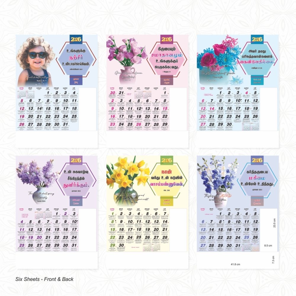 AC20 18x25" Tamil & English 6 Sheets - All Churches Bible Verse Christian Calendar 2026 Printers in Chennai, Coimbatore, Thanjavur, Madurai, Tiruchirappalli, Salem, Tiruppur, Erode, Vellore, Tirunelveli and all across Tamil Nadu, we provide high quality AC20 18x25" Tamil & English 6 Sheets - All Churches Bible Verse Christian Calendar 2026 printing proudct from Sivakasi. We print in all size, unique and customized designs with defferent media. Plesae check out our latest AC20 18x25" Tamil & English 6 Sheets - All Churches Bible Verse Christian Calendar 2026 price list, we ship AC20 18x25" Tamil & English 6 Sheets - All Churches Bible Verse Christian Calendar 2026 across Tamilnadu, India and Global.